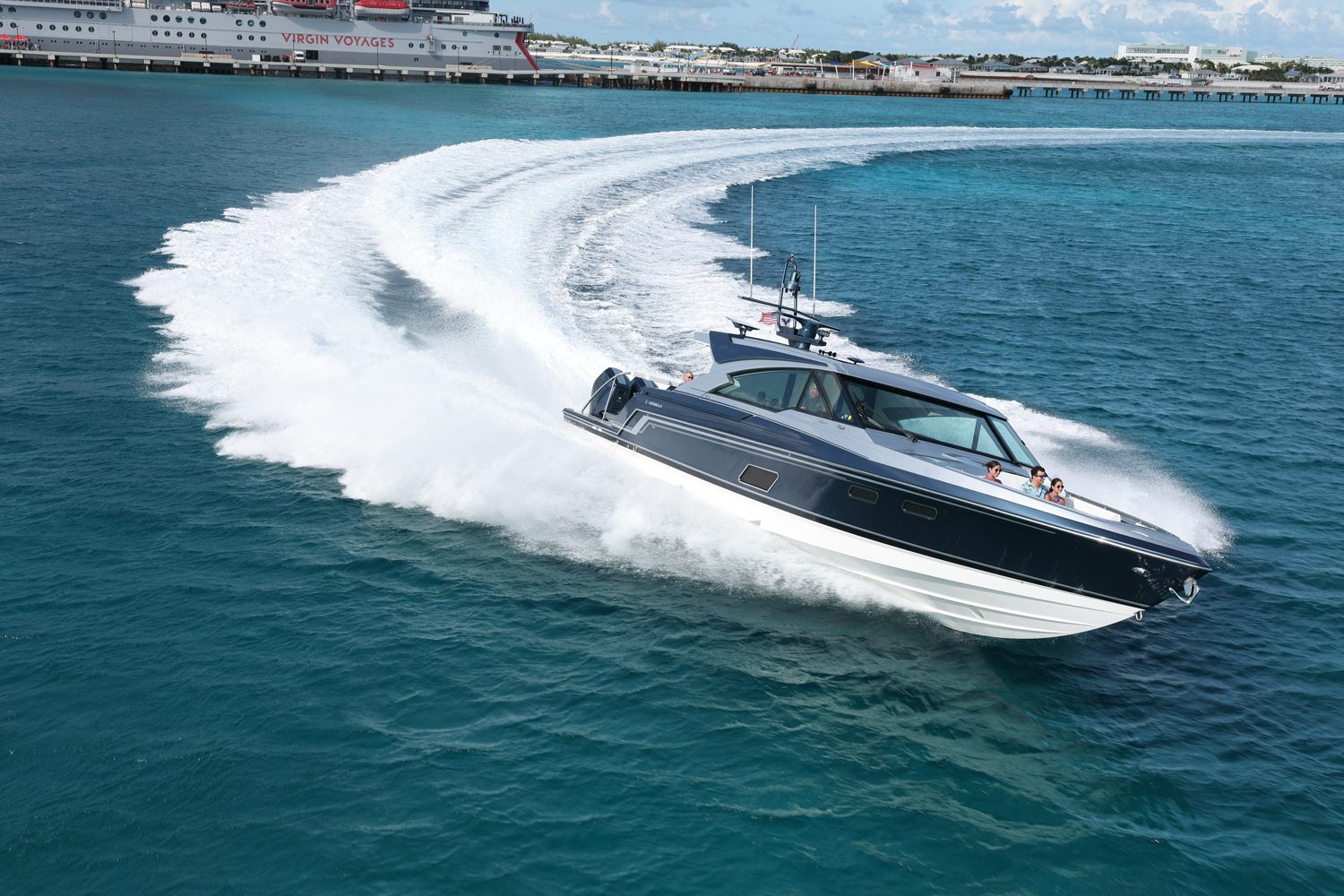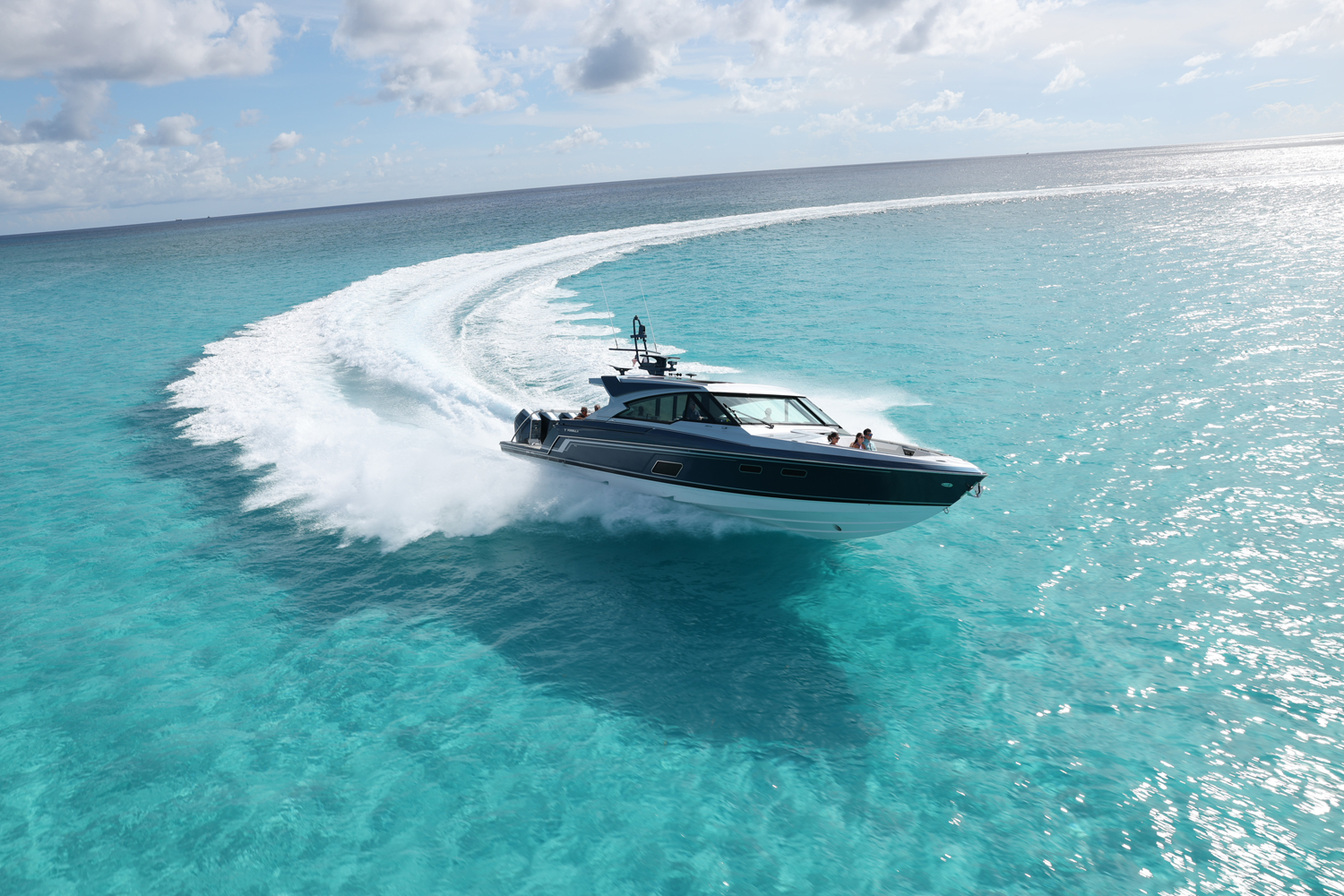 This Crossover will combine performance, art, stellar amenities and an exceptional layout that gives you and your passengers the best first impression. The boat is an impressive 53 feet 4 inches LOA, has a 14-and-a-half-foot beam, and is 50 feet from bow to transom.